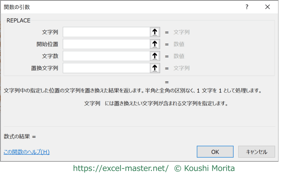 | 置換文字列 | ○ | 文字列 | 「開始位置」と「文字数」の指定内容を置き換える新しい文字を指定します。 ※置換後の文字 |