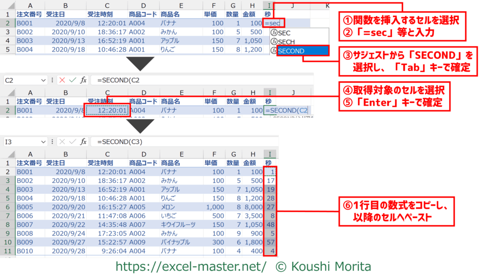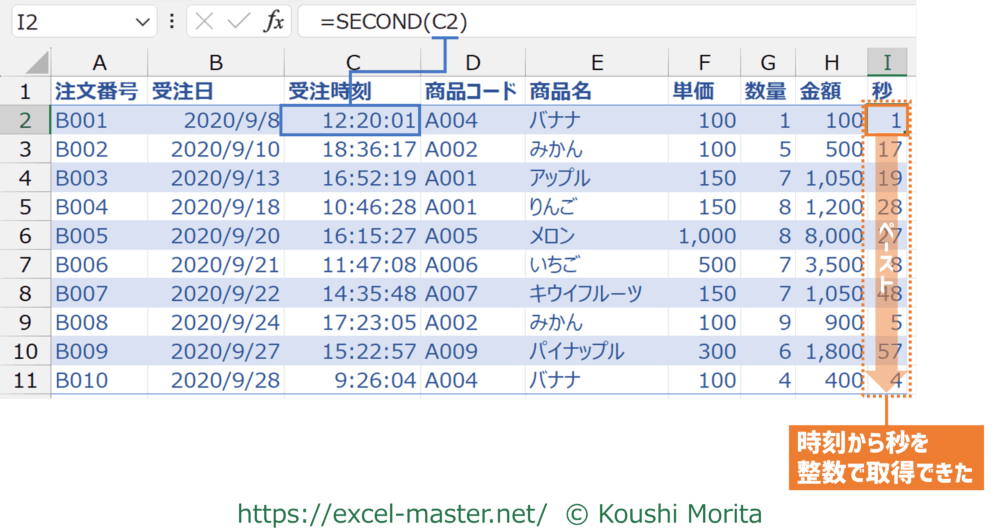 今回は「受注時刻」列のデータから「秒」を取得しました。