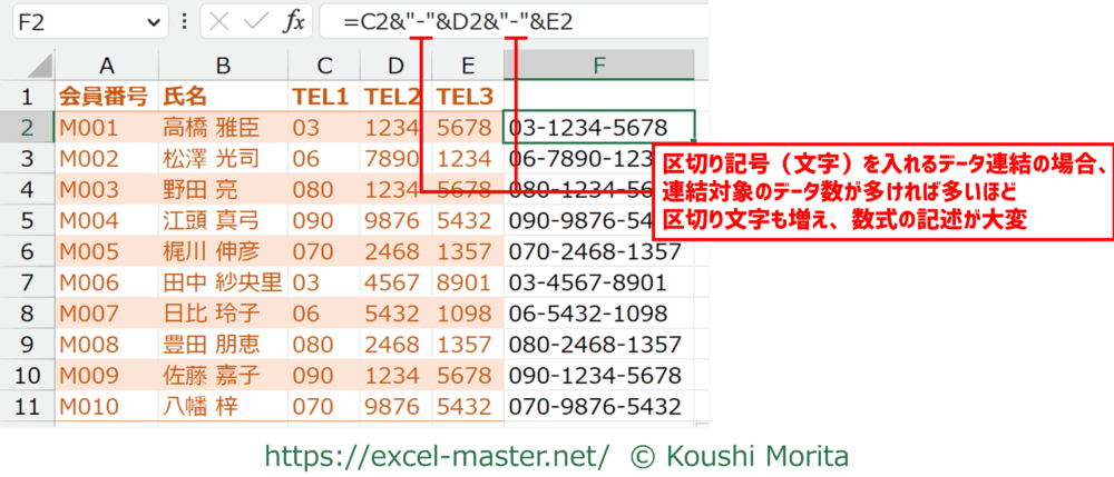 さらに、連結対象の文字列の間に区切り文字を入れる場合、こちらも一つずつ数式に記述する必要があり、さらに大変になります。