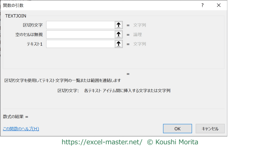 | 空のセルは無視 | ○ | 論理 | 「テキストn」で指定した文字列に空白セルが合った場合、区切り文字を入れるかどうかを指定します。 |