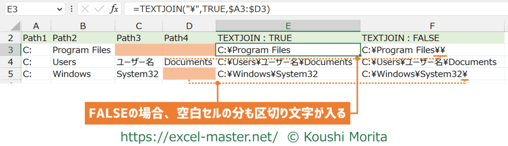 もう一方の引数「空のセルは無視」がFALSEの場合、空白セルがあっても区切り文字が入ります。
