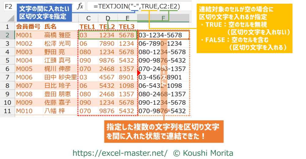 このように、連結対象の範囲内に空白セルがあった場合、引数「空のセルは無視」がTRUEだと空白セルとの間の区切り文字は入りません。