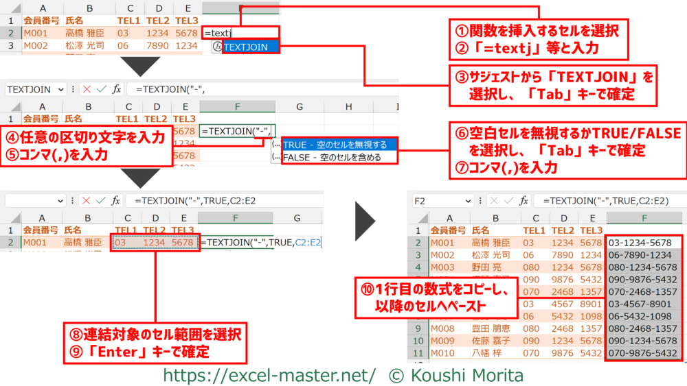 この場合、任意の区切り文字も含め、連結対象のデータを指定できる関数の「TEXTJOIN」を使うと良いです。