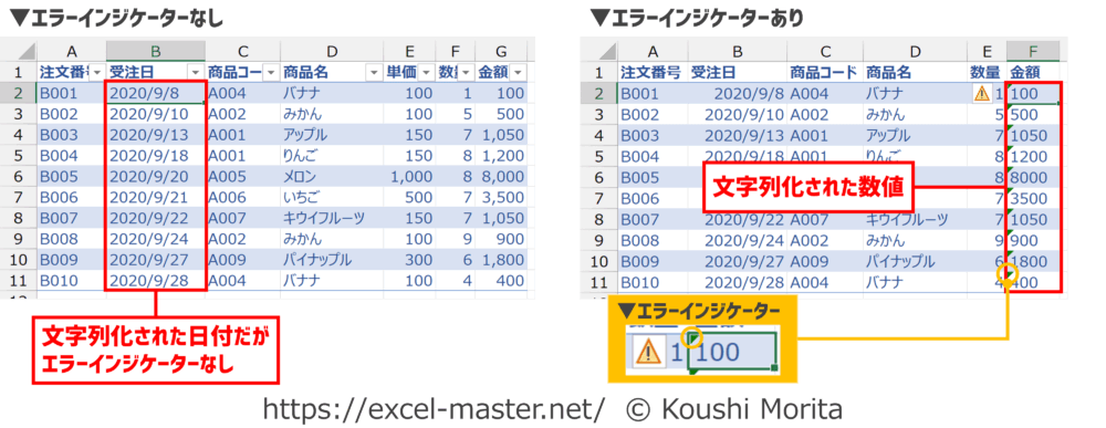 Excelはセルの値とデータ型が不一致の場合、エラーチェックという機能でセルへエラーインジケーター(セルの左上隅に表示される緑の三角形)を表示してくれます。