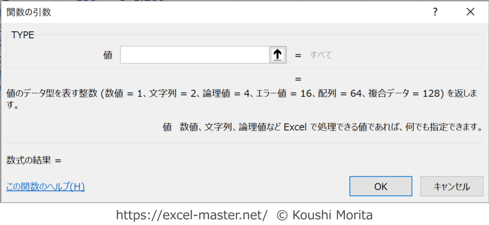 | 値 | ○ | すべて | データ型を調べたい対象のセルを指定します。 |