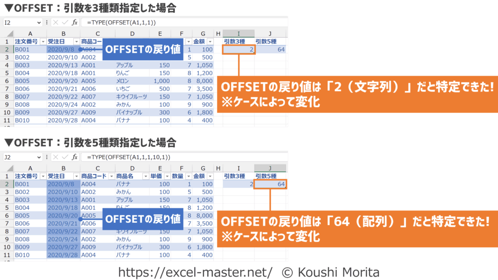たとえば、指定する引数の種類で戻り値が変わるOFFSETをネストした場合、このようにTYPEの戻り値が変わります。