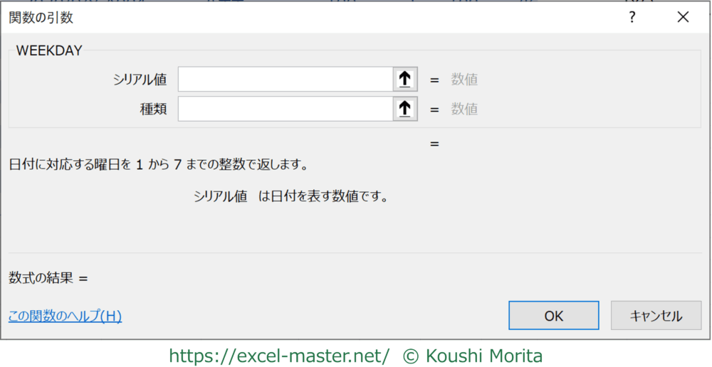 | 種類 | - | 数値 | 戻り値の種類(整数の範囲と各数値に対応する曜日のパターン)を数値で指定します。 |