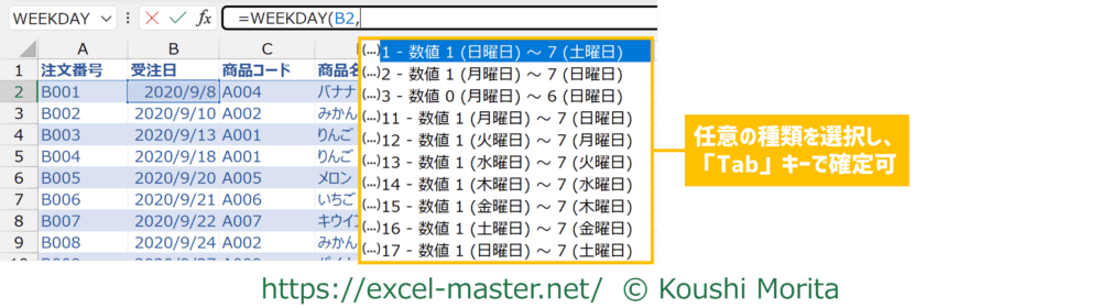 もし、パターンを変えたい場合は、引数「シリアル値」の後にコンマ(,)を入力すると、数式上でサジェストされるため、任意の種類を選択し「Tab」キーで確定しましょう。