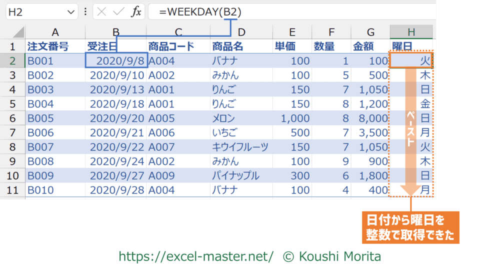 今回は「受注日」列のデータから「曜日」を取得しました。