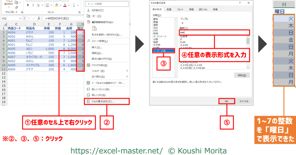 なお、表示形式を「曜日」にする場合、手順④は以下4種類のいずれかを入力しましょう(基本は「aaa」)。