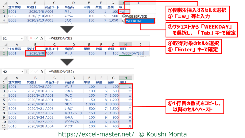 日付から「曜日」のみ取得したい場合は「WEEKDAY」が有効