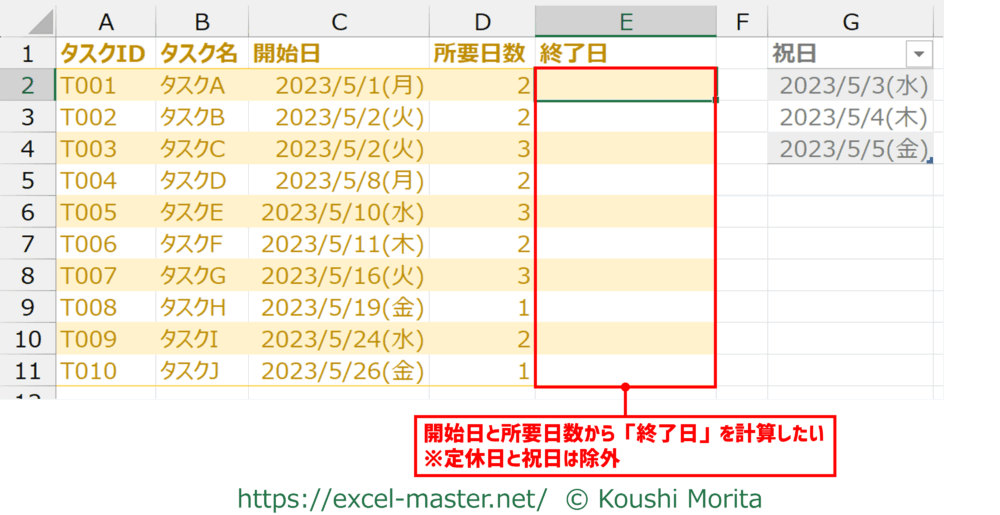 今回は「開始日」・「所要日数」列のデータと「祝日」テーブルから「終了日」を計算しました。