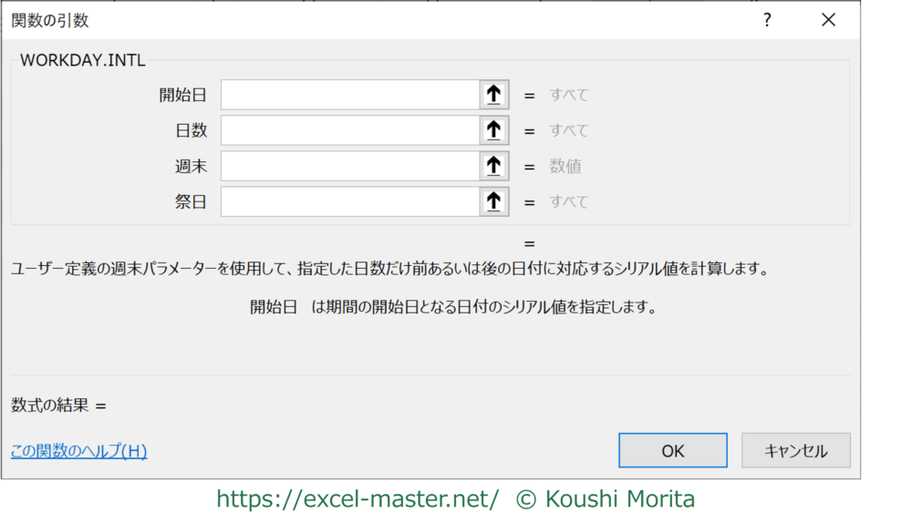 | 祭日 | - | すべて | 祝日等、「日数」から除外したい日付を示すテーブルまたはセル範囲を指定します。 |