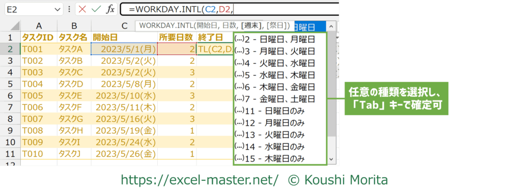 週末番号を選択する場合は、引数「日数」の後にコンマ(,)を入力すると、数式上でサジェストされるため、任意の週末番号を選択し「Tab」キーで確定しましょう。