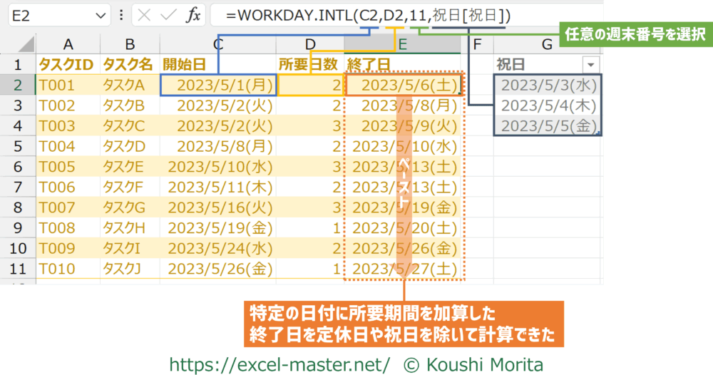 数式の例:=WORKDAY.INTL(C2,D2-1,11,祝日[祝日])