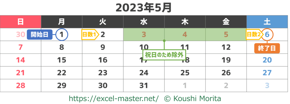 どういうことか、開始日「2023/5/1」、日数「2」の場合でカレンダーを使って確認していきましょう。