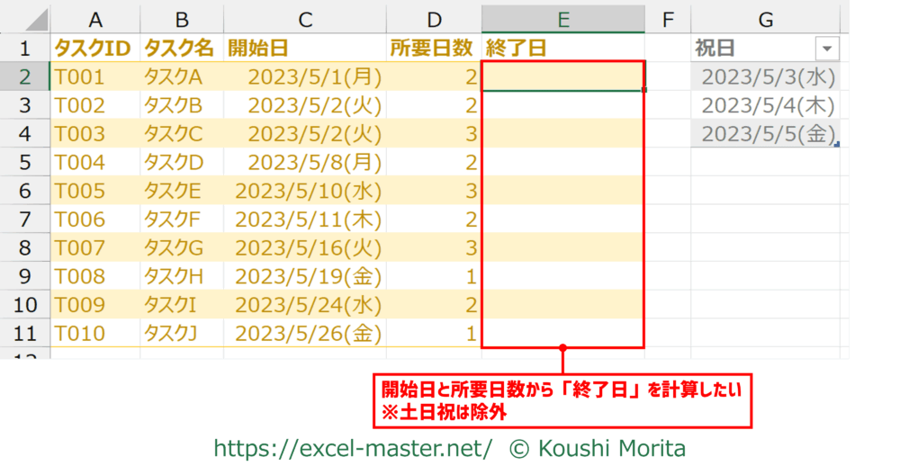 WORKDAYを使い、開始日と日数から「終了日」を計算するイメージは以下の通りです。