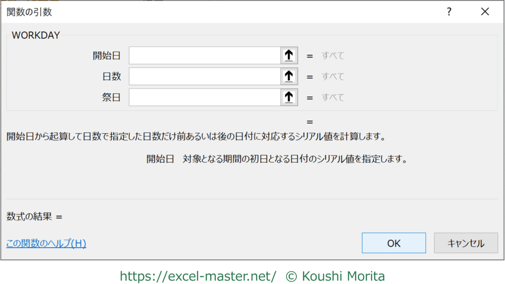 | 祭日 | - | すべて | 祝日等、「日数」から除外したい日付を示すテーブルまたはセル範囲を指定します。 |