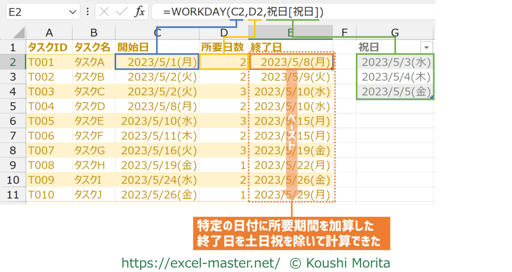 開始日+日数で「終了日」を算出したい、かつ土日祝休みの場合は「WORKDAY」が有効