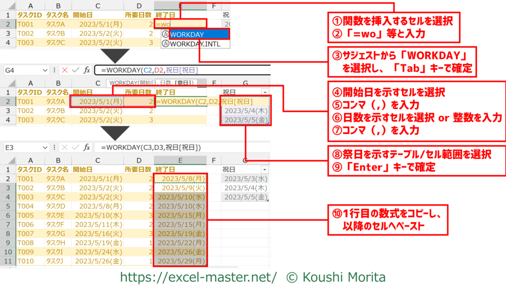 WORKDAYを使うことで、土日祝を除き、特定の日付に所要日数を加算した「終了日」の日付(シリアル値)を計算できます。