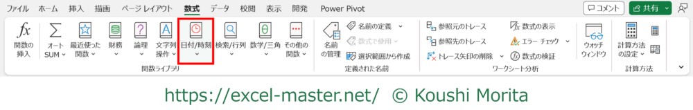 あくまで参考情報となりますが、WORKDAYはリボン「数式」タブの関数ライブラリの「日付/時刻」に分類されています。