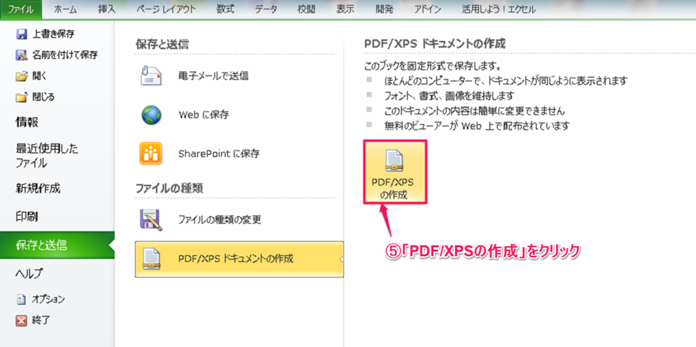 4. 「PDF/XPSドキュメントの作成」をクリック