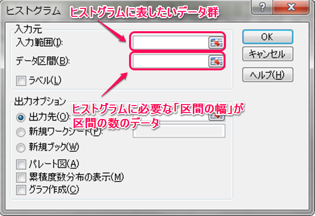 実際にヒストグラムを作成する際のダイアログを見てみると、大きく2種類のデータを指定してあげる必要があります。