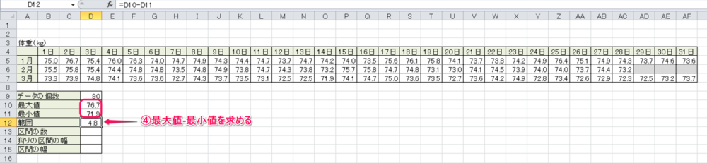 4. 「最大値-最小値」で「範囲」を求める