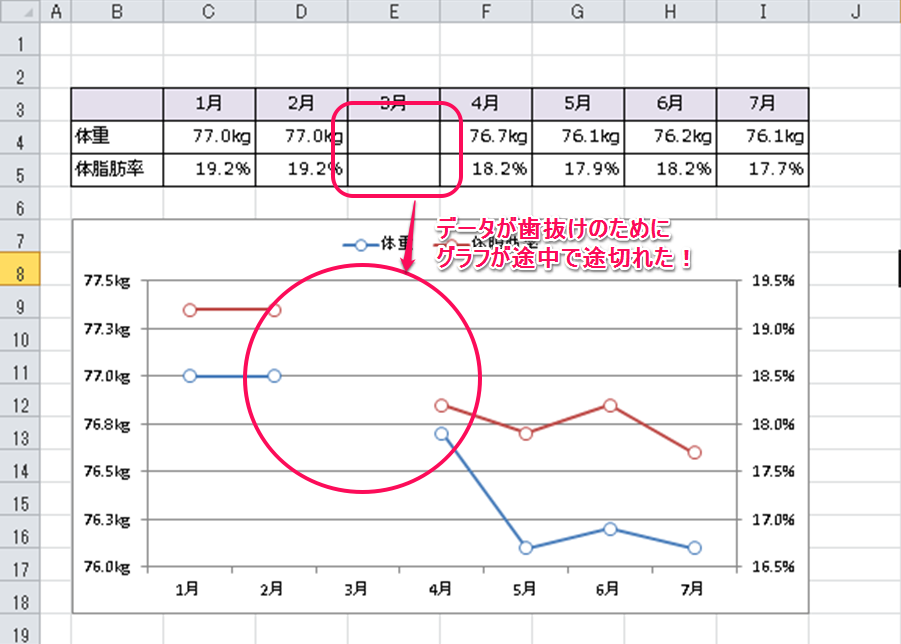 Excelで折れ線グラフを使っていた際、グラフの根拠としていたデータの中で歯抜けになってしまう場合も発生します。