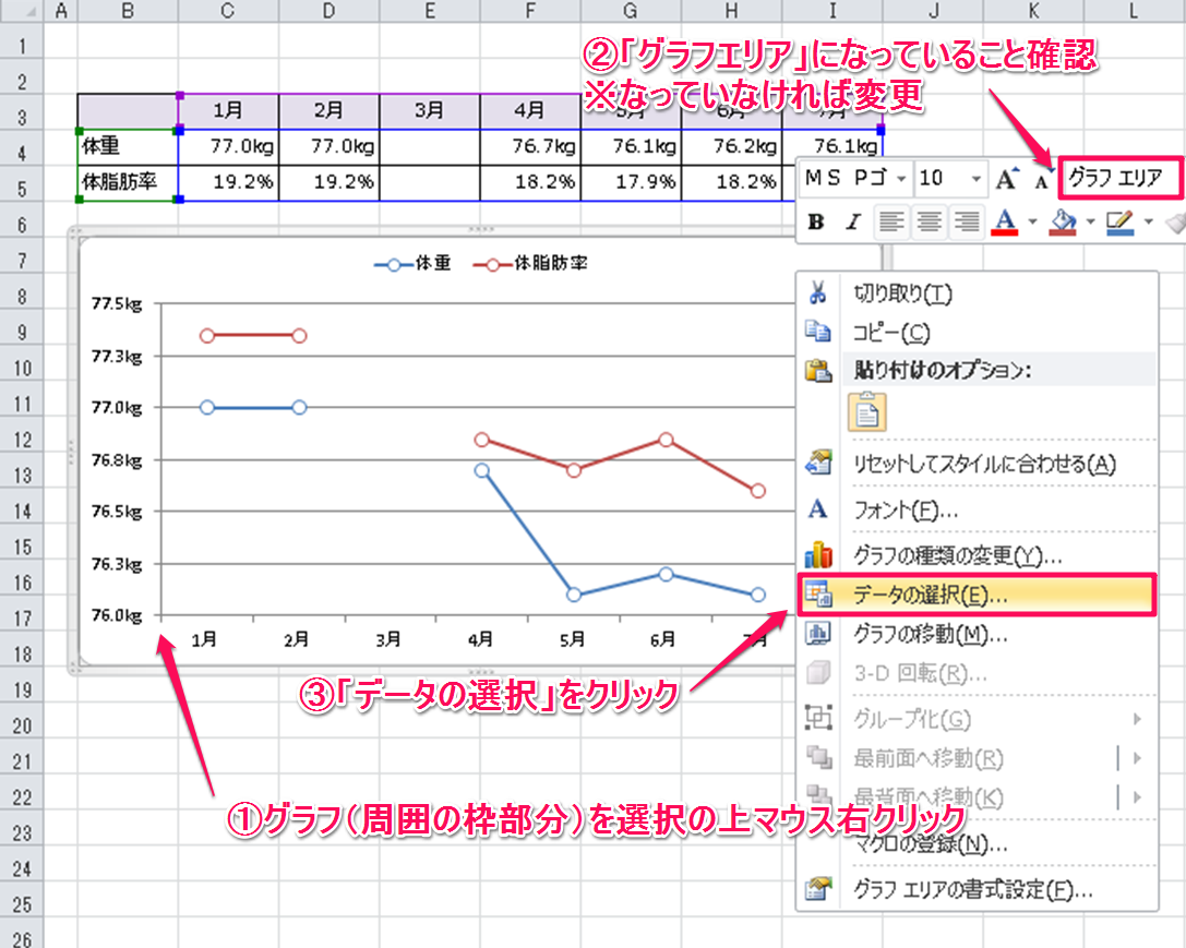 1.の手順の際、グラフ内の枠の余白部分を意識してマウス右クリックすると「グラフエリア」になりやすいです。