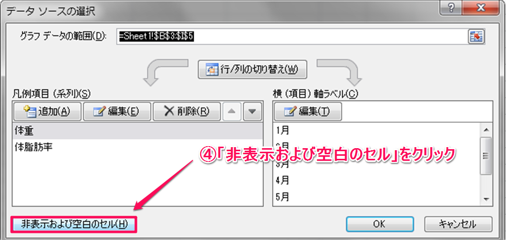 「非表示および空白のセルの設定」ダイアログが表示されます。