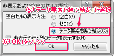5. [空白セルの表示方法]を「データ要素を線で結ぶ」に選択