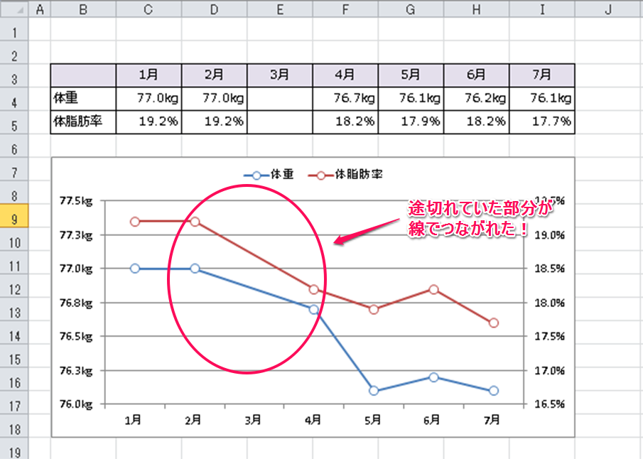 グラフ上を確認すると、途切れていた部分が線でつながれました!