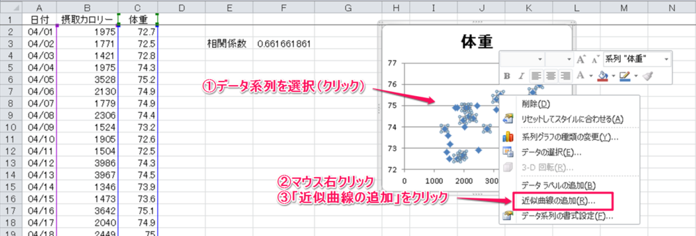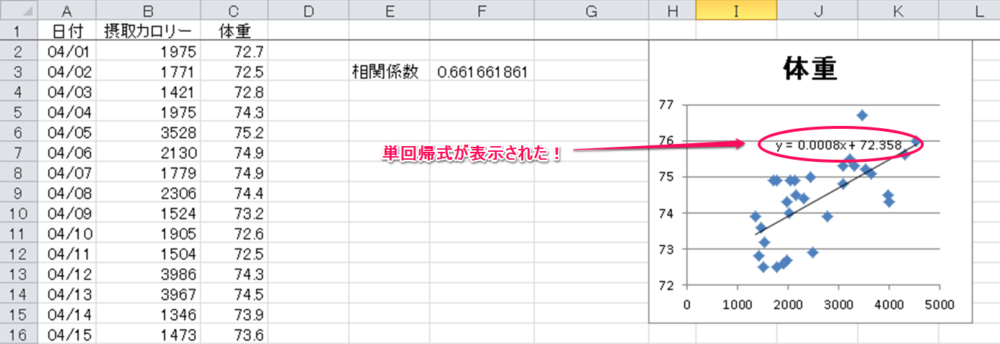今回のサンプルは私の2014年4月度の摂取カロリーと体重の日別のデータを散布図にまとめており、相関係数は「0.6616…」と「相関がある」データとなっています。