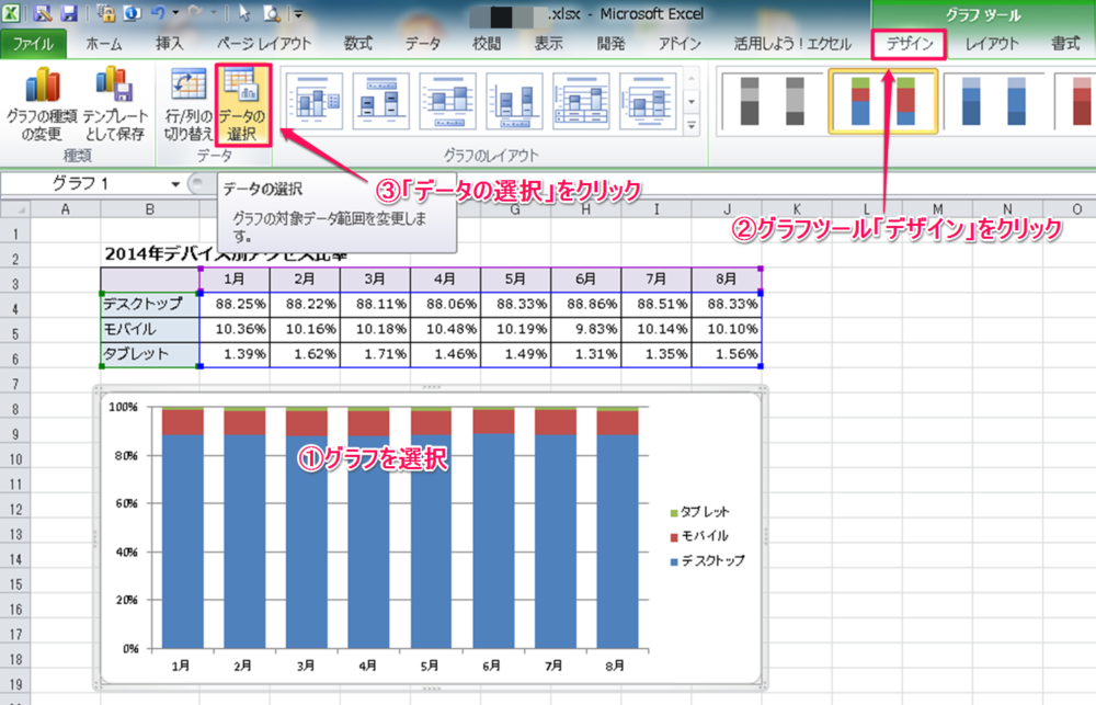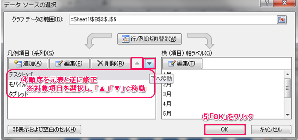2.の手順以降は グラフエリアの上でマウス右クリック⇒「データの選択」をクリック でもOKです。