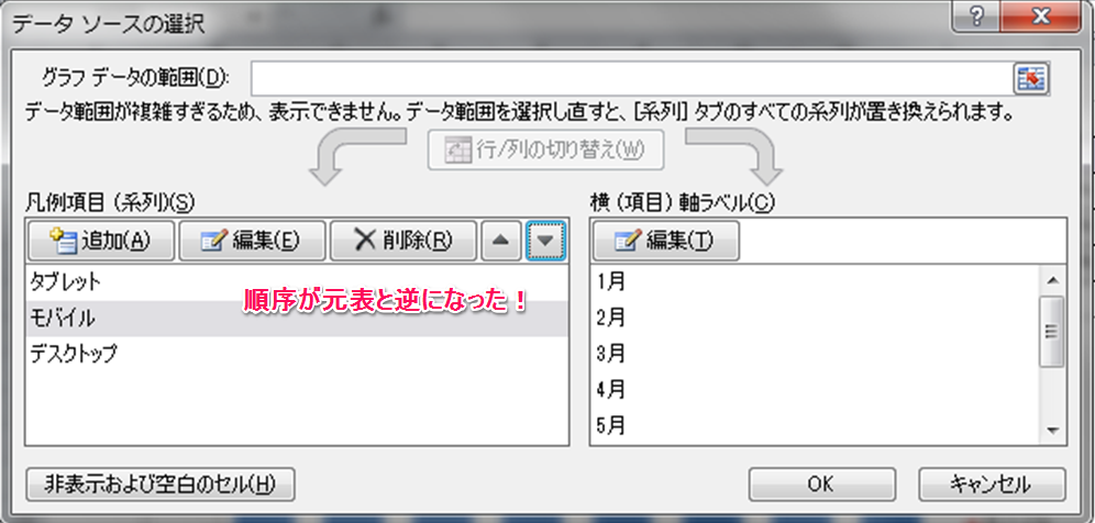 しかし、凡例項目のデータソース上は元表と並びがいっしょなのに、なぜにグラフ上では逆に表示されるのかちょっと腑に落ちないですけど、ひとまず上記の通り設定を行えば見た目的にはOKです。