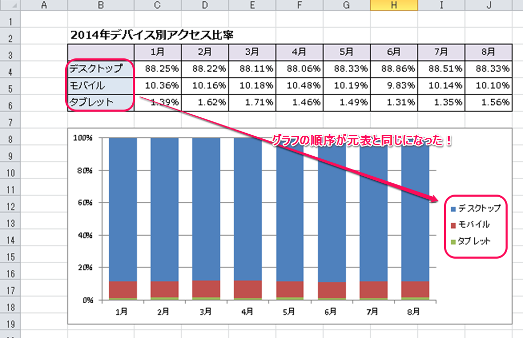 Excelで積み上げ縦棒グラフを作成していて、グラフの順序と元表が逆になっていて気になったことはないですか?