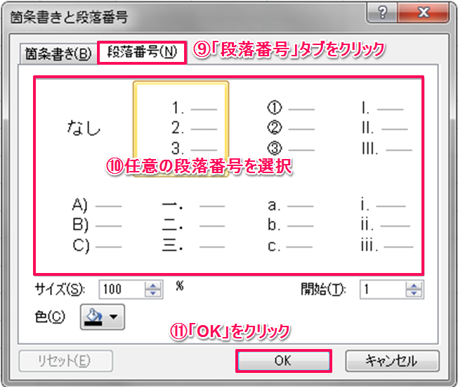 9. 「段落番号」タブをクリック