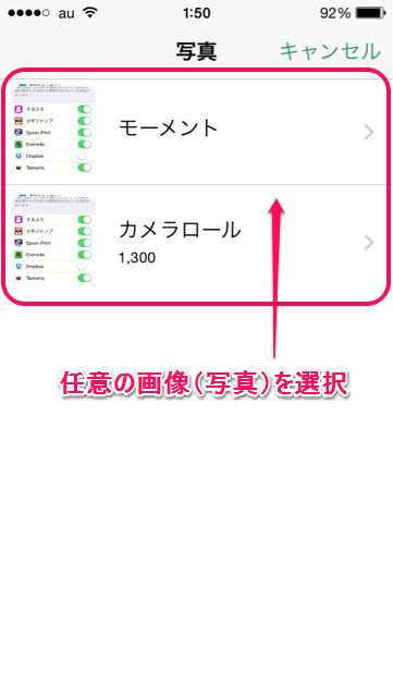 上記5.の手順でiPhoneのプライバシー設定で本アプリの写真アプリへのアクセス権が有効化されていない場合は上図が表示されます。