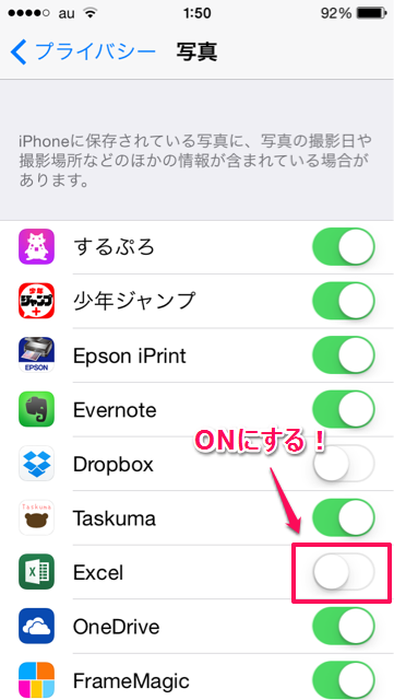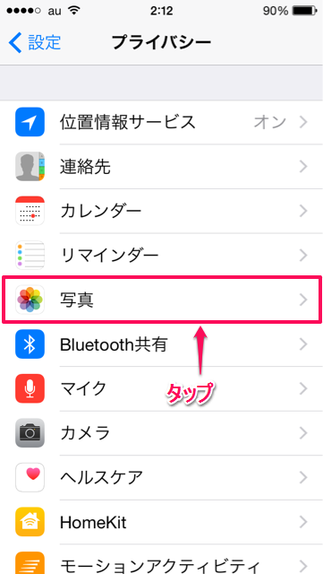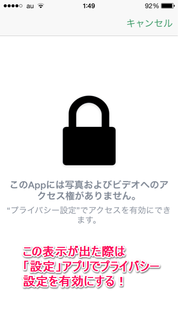 iPhoneのプライバシー設定で本アプリの写真アプリへのアクセス権が有効化されていない場合は設定を変更する必要があります。