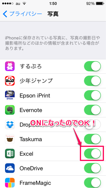 上図のように「Excel」アプリの横が緑色になっていればOKです!