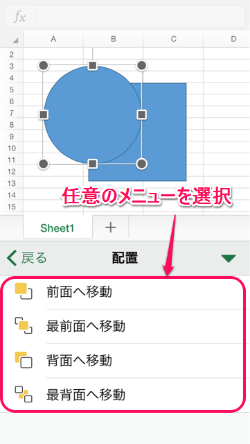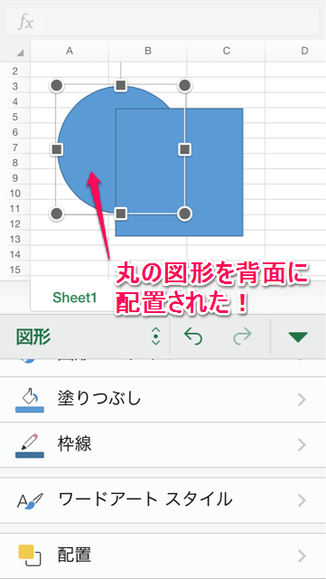 無事前面になっていた丸の図形を背面に配置を変更することができました。